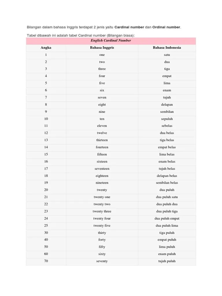 Nah, cardinal numbers ini terdiri dari basic numbers (angka satuan), belasan, puluhan, ratusan, ribuan, . Tabel dibawah ini adalah tabel cardinal number (bilangan biasa): . Ketika dinyatakan sebagai angka , dua huruf. 2 pengertian bilangan ordinal dalam bahasa inggris. Ordinal number adalah angka yang mengindikasikan posisi sesuatu dalam daftar.
