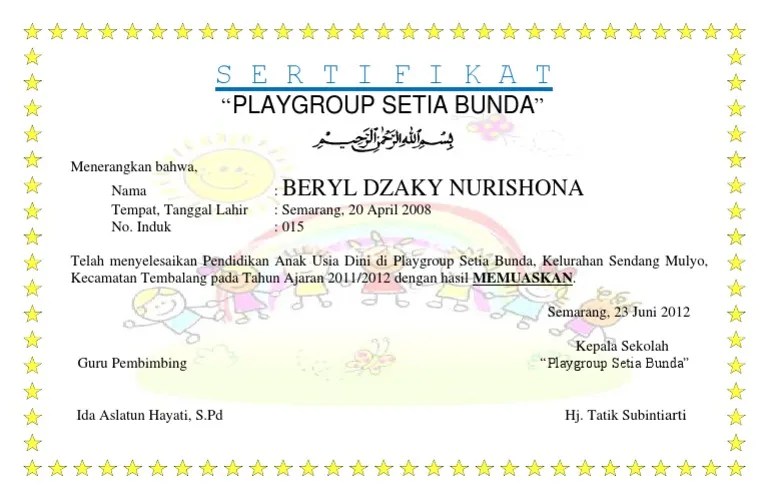 Download contoh format sertifikat piagam ijazah siswa anak paud tk kb tpa sps. File master desain sertifikat paud kb tk dapat diunduh gratis dan diedit sesuai dengan kebutuhan. Disebut juga completion certificate, preschool leaving . Download contoh format sertifikat/ piagam/ ijazah siswa anak paud tk kb tpa sps. Download bingkai ijazah kosong dan sertifikat piagam penghargaan format word untuk postingan .